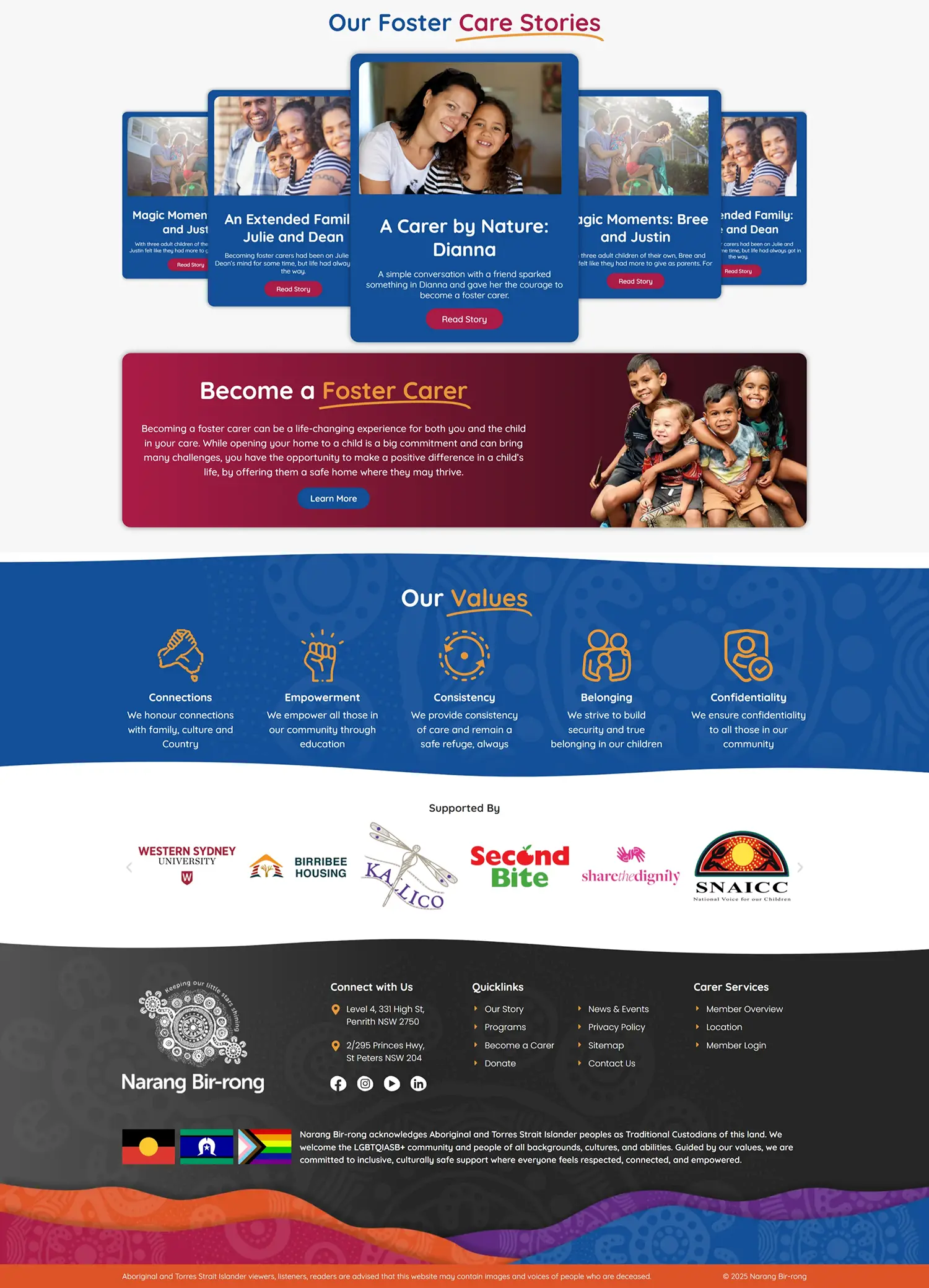 Narrang Bir-rong Aboriginal Corporation (NBAC) is a culturally grounded organisation supporting Aboriginal and Torres Strait Islander children, young people and families across New South Wales. Through programs in Family Preservation, Foster Care, and Carer Support, NBAC nurtures cultural identity and connection to community, family and land. Their approach prioritises culturally appropriate care, often matching children with carers from the same community or language group. NBAC’s mission is to foster long-term wellbeing through respectful, inclusive support that honours heritage and strengthens belonging.